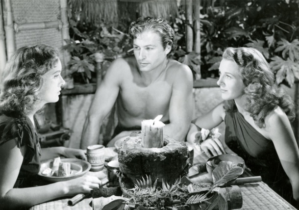 Weissmuller wasn’t the first actor to play Tarzan, but he was by far the most successful and may still be the most well-known. By 1945, however, he was no longer the trim, leonine lord of the jungle seen in Tarzan the Ape Man (1932) and Tarzan and His Mate (1934). If you’ve never seen Weissmuller in action, those two are the ones to see. Aside from the fact that they’re great, albeit dated, adventure pictures, watched in succession the two films offer the pleasure of seeing O’Sullivan’s Jane transform from a prim, fully clothed Englishwoman into a scantily clad lover of the jungle god, living with him in the treetops, swinging from vines, and swimming in the nude. In fact, Tarzan and His Mate would be the last film in which O’Sullivan appeared in such states of undress. By the third Weissmuller film, Tarzan Escapes! (1936), O’Sullivan’s skimpy two-piece costume became a more concealing one-piece outfit, and she even started wearing shoes. By the fourth film in the series, the two adopted a son and lived together in a jungle tree house as a family unit, which satisfied bourgeois sensibilities, but wasn’t nearly as sexy or exciting as when it was just the two of them, fighting wild animals and bad guys in between outdoor lovemaking sessions.