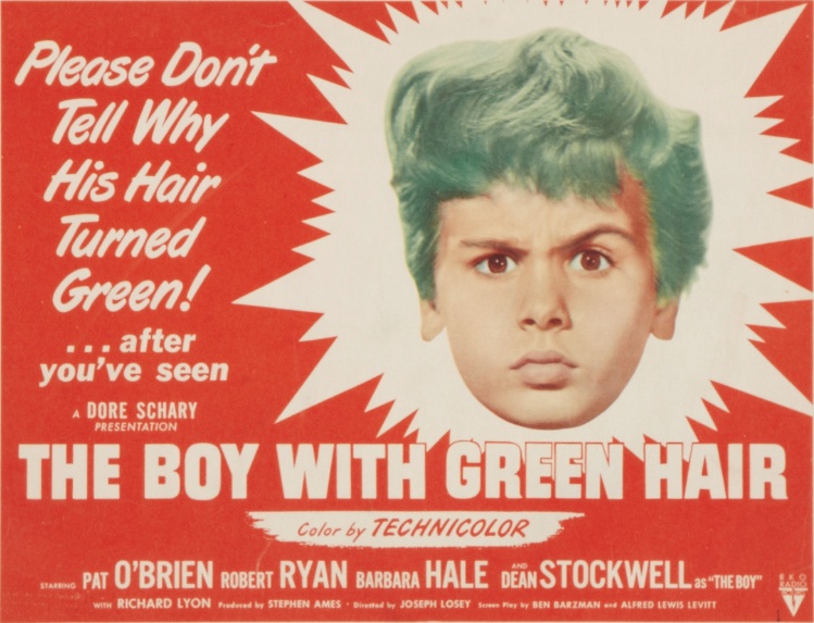 The Boy With Green Hair was Joseph Losey’s first feature-length film. It’s a lovely little Technicolor parable that opens with the song “Nature Boy.” (You know, the one about “a very strange, enchanted boy”?) Nat King Cole’s recording of the tune was a big hit in 1948, and was the #1 single in the United States for seven weeks. The melody of the song recurs throughout the film.