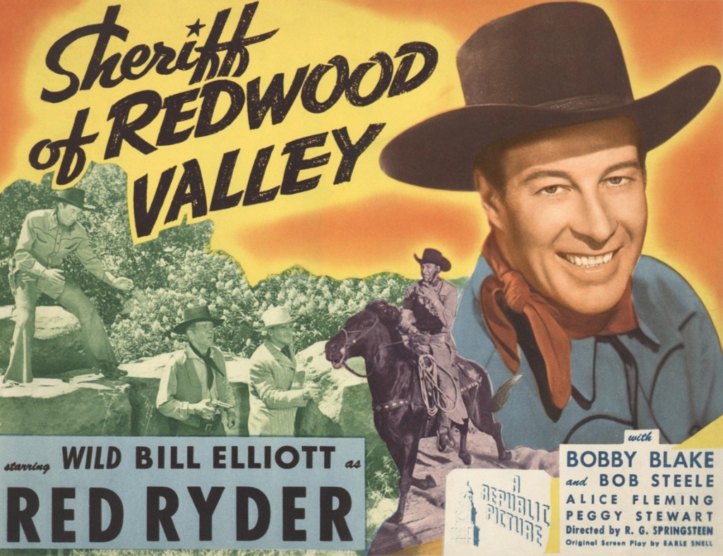 I really like the Red Ryder movies with “Wild” Bill Elliott and Bobby Blake. Sheriff of Redwood Valley is the third one I’ve seen, and watching it after a couple of really bad P.R.C. westerns drove home an opinion I’ve long held; a low budget is no excuse for a bad movie.