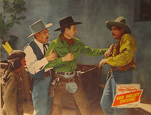 When Sun Valley Cyclone begins, Ryder (Bill Elliott) is tracking a man who last went by the name of “Blake” in Wyoming, but has probably changed his name several times to evade the law. Ryder is accompanied, as always, by his pint-sized Indian sidekick, Little Beaver (Robert “Bobby” Blake). While discussing the issue with the sheriff of a sleepy Arizona town, Blackie Blake (Roy Barcroft) draws a bead on Ryder from his hiding place. Just in the nick of time, however, the black stallion Thunder rushes to Ryder’s aid, trampling Blake. Blake is basically uninjured, but the townspeople see only a killer horse that must be put down. Ryder intervenes, and says that Thunder must first receive a fair trial.