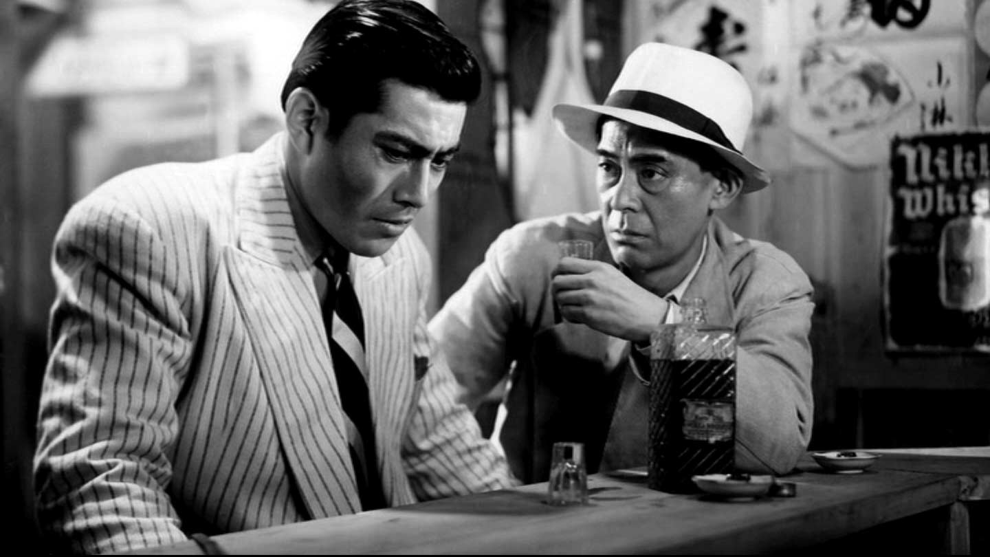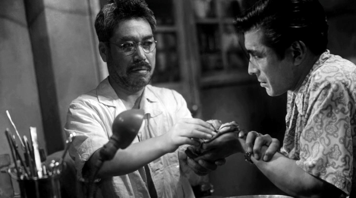 One day a young Yakuza thug named Matsunaga (Mifune) walks into Sanada’s office to have a hand wound treated, but the doctor suspects Matsunaga has a bigger problem — tuberculosis, which was rampant in post-war Japan. With the swagger typical of a young gangster, Matsunaga refuses to submit to treatment or to doctor’s orders, a problem compounded by Sanada’s angry and blunt way of talking to his reluctant patient.